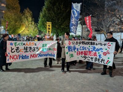 今こそ憲法の精神を生かす時。集会終了後、英語の