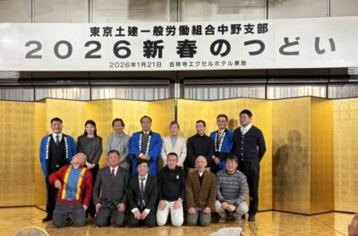 深石委員長の挨拶で開幕し、本部挨拶に続き、西部ブロックおよび友好支部を代表して杉並支部の槍田委員長より祝辞を頂きました。国会議員からの挨拶の後は鏡開き。鈴木副委員長の音頭で乾杯。宴中には各会派からの挨拶、アトラクション、抽選会、拡大報奨の表彰が行われ、終始賑やかなひと時となりました。最後は石田副委員長による「当事締(とうじめ)」で力強く締めくくられました。